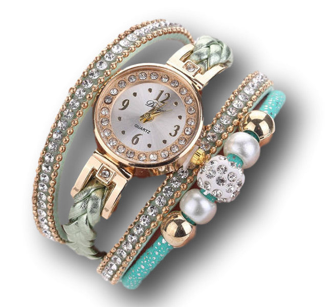 Exkluzív gyöngyös-kristálygolyós karkötőóra menthol