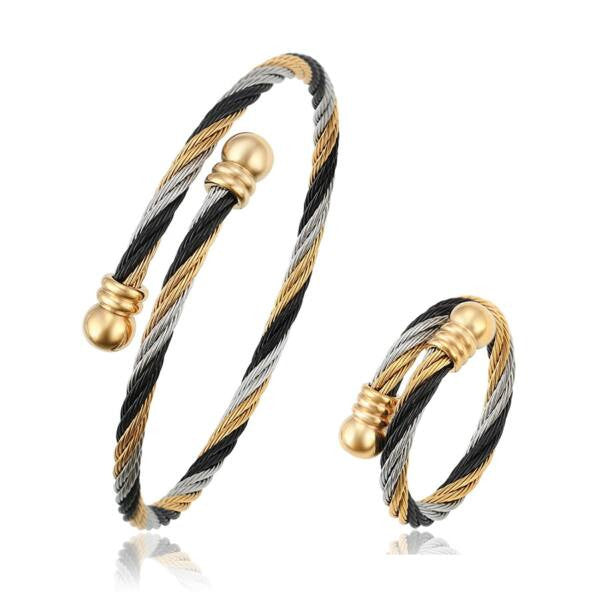 Rugalmas, nemesacélból készült karkötő-gyűrű szett bikolor színben.