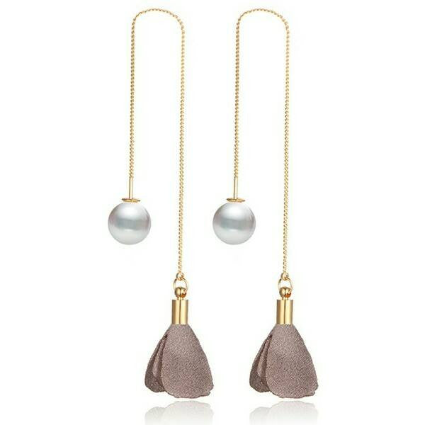 Trendi elöl-hátul lógatós fülbevaló virág gyönggyel barnás